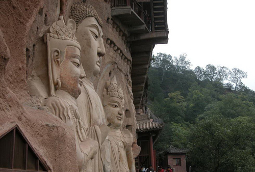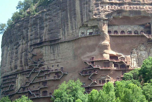 麥積山石窟為中國四大石窟之一,其它三窟為:龍門石窟、云岡石窟和敦煌莫高窟。麥積山石窟屬全國重點文物保護單位,也是聞名世界的藝術寶庫。麥積山位于甘肅省天水市東南約35公里處,是我國秦嶺山脈西端小隴山中的一座奇峰,海拔1742米,但山高離地面只有142米,山的形狀奇特,孤峰突起,猶如麥垛,因此人們稱之為麥積山。