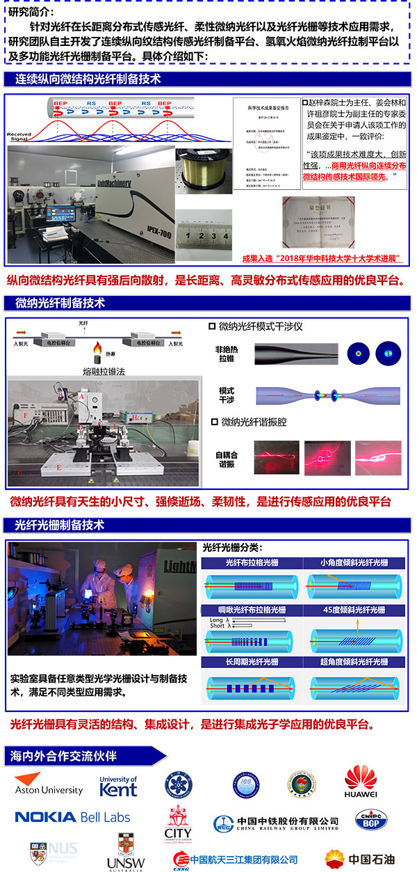 研究所致力于特種傳感光纖的制備與智能感知系統(tǒng)的研究開發(fā)。發(fā)展以特種傳感光纖為載體的智能感知系統(tǒng),以實現(xiàn)高速泛在、天地一體、集成互聯(lián)、安全高效的信息物聯(lián);開發(fā)基于光纖傳感技術(shù)的基礎(chǔ)設(shè)施和工業(yè)生產(chǎn)安全監(jiān)測、深海、深地綜合監(jiān)測技術(shù)、以及健康診療技術(shù),為構(gòu)建智慧城市和智能世界提供感知層通用方案。