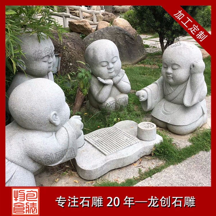 現在的禪意小和尚石雕像在寺院見到的相對來說少一些,反而在一些比較有禪意的場所更為常見。這是極其貼近人們生活的雕像,既帶著佛教的禪意,又能增添環境的生趣,是公眾場所以及一些商業廣場綠地上經常擺放的。根據擺放場景的不同,小沙彌的訂購數量一般也不大一樣。如果是擺放在門口的,則通常是左右側各放置一個,符合建筑物風格的即可。比如有家飲食店門口就左右兩側各擺放一尊下棋小沙彌和一尊澆花的小沙彌像。而如果是擺放在相對開闊的綠地或者廣場中,則可以根據個人喜好選擇合適的款型和數量進行擺放。