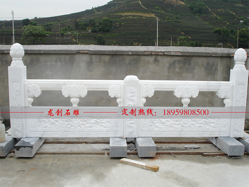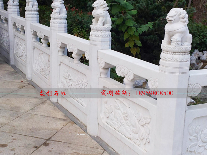 漢白玉顏色美觀,石材花紋清晰,漢白玉價(jià)格昂貴,根據(jù)不同的等級(jí)從特技漢白玉開(kāi)始劃分,價(jià)格自然也不一樣,同時(shí)不同的地方生產(chǎn)的漢白玉價(jià)格也是不同的。龍創(chuàng)石雕雕刻的這款漢白玉石雕漢白玉欄桿顏色通體發(fā)白,長(zhǎng)方體立柱上表面浮雕飛鳳,在立柱頂部是浮雕飛龍的圓柱,欄桿欄板以動(dòng)物的形狀雕刻,兩只漢白玉石獅子前腳踩在一顆石球上,背上各有一只小獅子,這款欄桿雕刻了多種吉祥寓意的動(dòng)物,雕刻工藝復(fù)雜,寓意豐富,適合高檔場(chǎng)所使用。