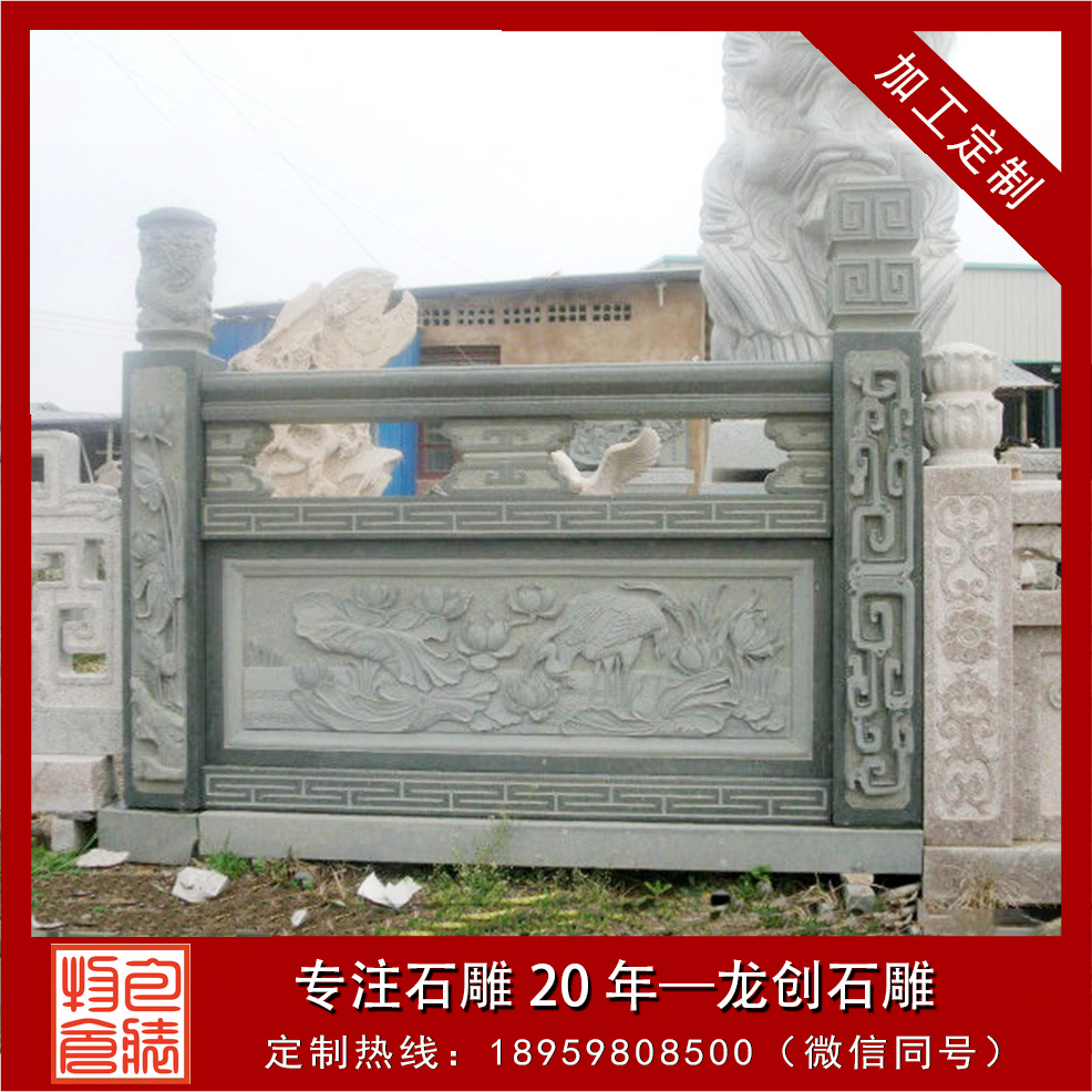 石雕欄桿不僅有安全維護(hù)作用,具有很好的裝飾效果。望柱柱頭常做成回雌形式,題材多為寓意吉祥的勸物、花頭等立體型;菊柱多飾成荷葉凈瓶形式,尋杖以線腳裝飾;欄板是重點(diǎn)裝飾的部分,常施以扮致的雌飾,題材廣泛,并與拄頭的內(nèi)容相呼應(yīng)。由立柱、墊塊、柱頭、抱鼓、欄板組成的石欄桿有時(shí)尚、環(huán)保、美觀、不變形、抗老化的優(yōu)點(diǎn),所以被廣泛應(yīng)用于交通橋梁、水利、公園等護(hù)欄工程。它的種類多種多樣,各種石材都可制作,常見(jiàn)的還是漢白玉欄桿、花崗石欄桿和青石欄桿。