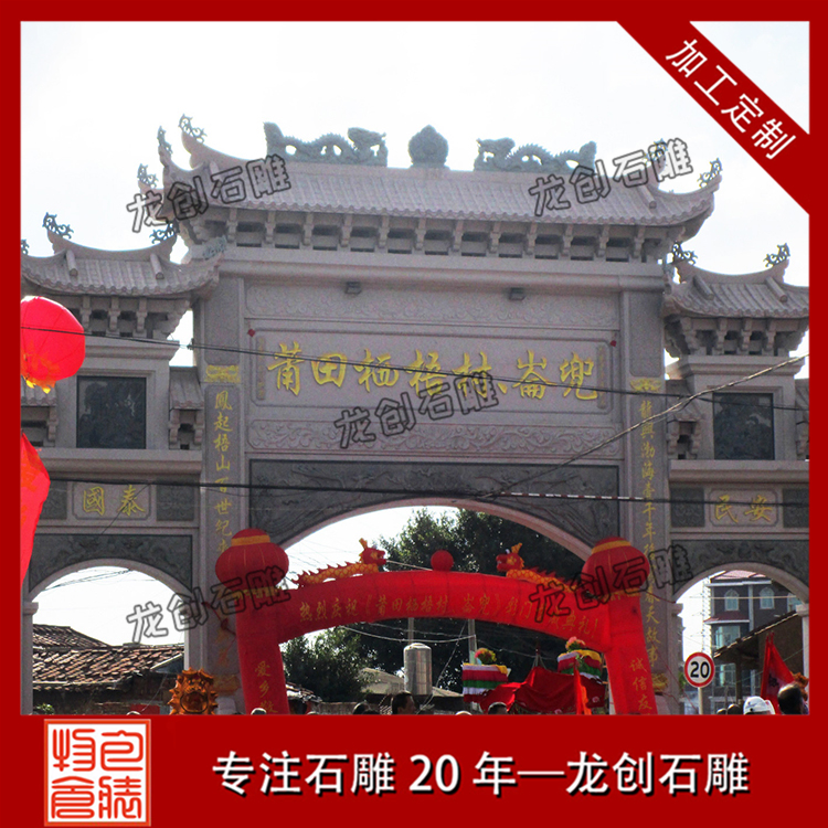村頭石牌樓制作材質有青石、花崗巖、大理石等,樣式有單門、三門、五門,三樓、五樓、七樓等,雕刻的圖案也是多種多樣,因此村頭石牌樓價格沒有一定的,預算多可選擇的樣式也就多,大理石牌樓價格,請致電我司咨詢,我們會給您一個專業的報價。