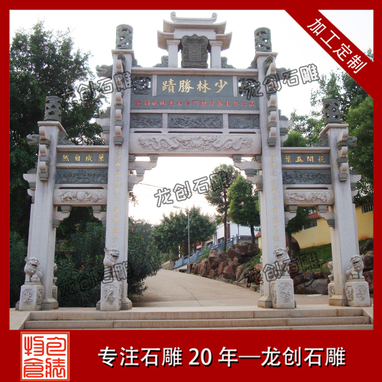 石牌坊廠家提供的高清寺院石牌坊圖片中,寺廟大門牌坊樣式眾多,常見的有一門三樓、三門三樓、三門五樓、三門七樓、五門五樓、九樓等樣式,從這里就能看出寺廟大門牌坊圖片樣式有很多,雕刻工藝精湛,外觀造型雄偉大氣,制作寺廟大門牌坊的材質(zhì)也越來越多,如青石、大理石、花崗巖、漢白玉、輝綠巖等多種天然石材都是現(xiàn)在制作寺廟大門常用的。